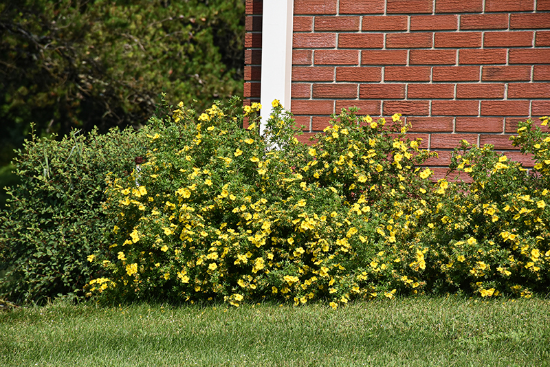 A compact broadly spreading shrub with showy bright yellow flowers from June until frost and fine textured dark green foliage; the ultimate flowering shrub for northern gardens, hardy, tough and adaptable to all conditions, but dislikes wet soils