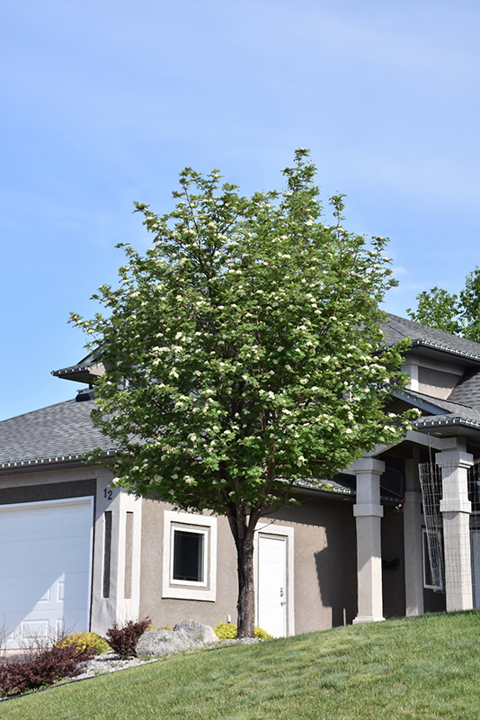 A stunning pyramidal accent tree, featuring clusters of white flowers in spring followed by orange-red berries into winter; shiny gray bark, attractive compound leaves turn orange and yellow in fall; needs well drained soil, resistant to fireblight